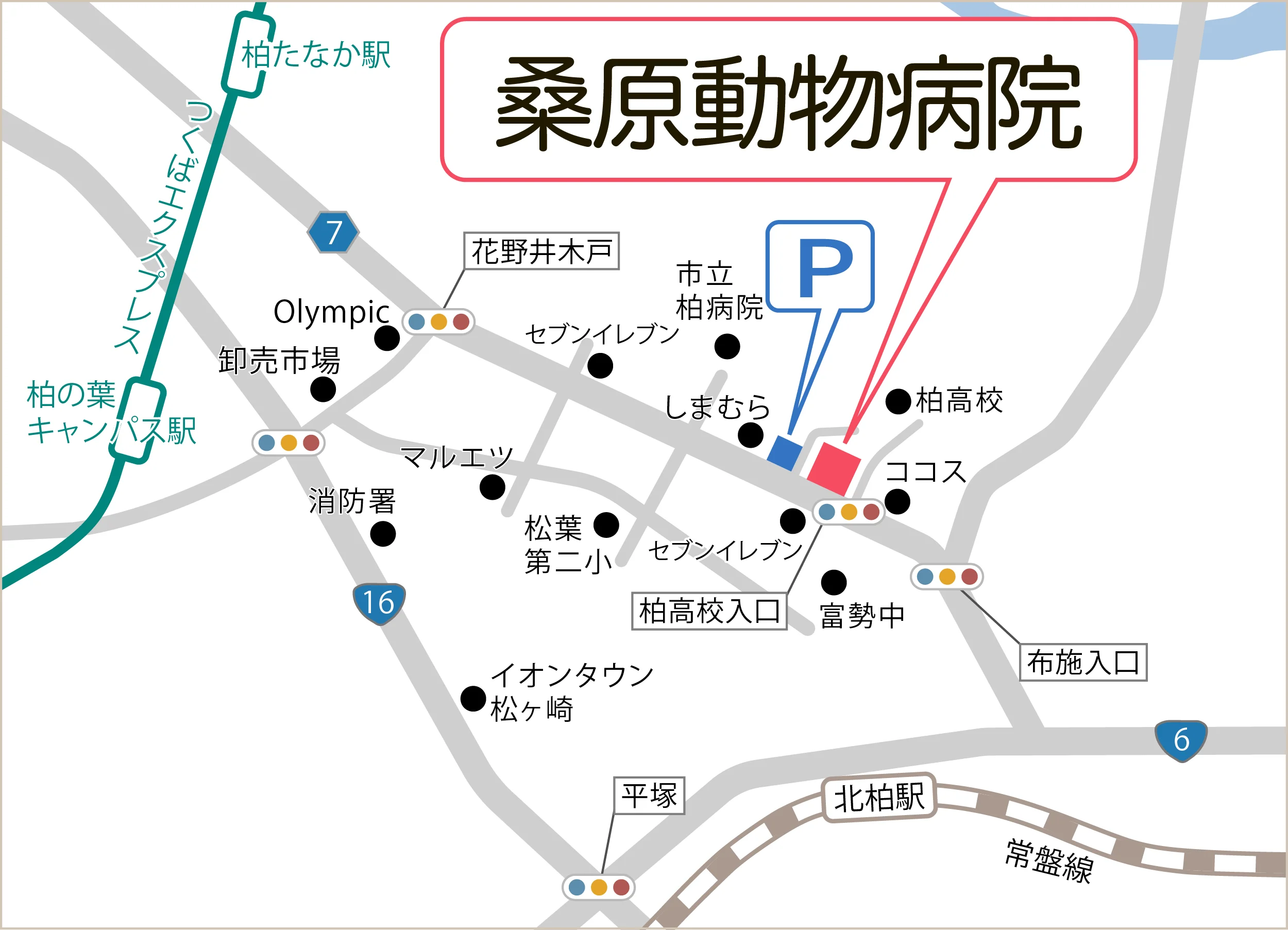 アクセス情報 桑原動物病院 > アクセス情報地図 GoogleMapを拡大して見る車でのアクセス方法専用駐車場10台駐車可能病院横の駐車場2台駐車可能施設概要施設名桑原動物病院(Kuwahara Animal Hospital)所在地〒277-0825千葉県柏市布施146-17TEL04-7132-1223